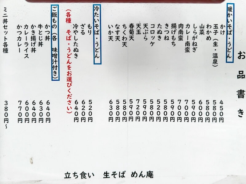 めん庵さんのメニュー