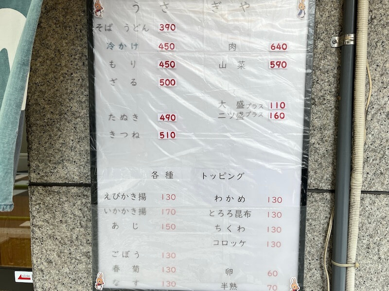 写真は、うさぎやさんのメニューです。天ぷらは定番のラインナップで7種類ほどあり、それ以外にはたぬき、きつね肉そば、山菜、とろろ昆布、コロッケなどがあります。蕎麦とうどんがあり、かけ、冷かけ、もり、ざるがあります。